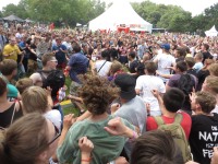 Kann man auch machen: Wall of Love. Kapiert hier nur keiner, die Gesichtsausdrücke lassen jedenfalls erahnen, dass es beim Aufeinandertreffen der Fronten nicht um bloßes Umarmen gehen wird. Und ich dachte, Free Hugs auf Festivals seien mittlerweile Mainstream. Verdammt, ich bin heute aber mal wieder negativ eingestellt.