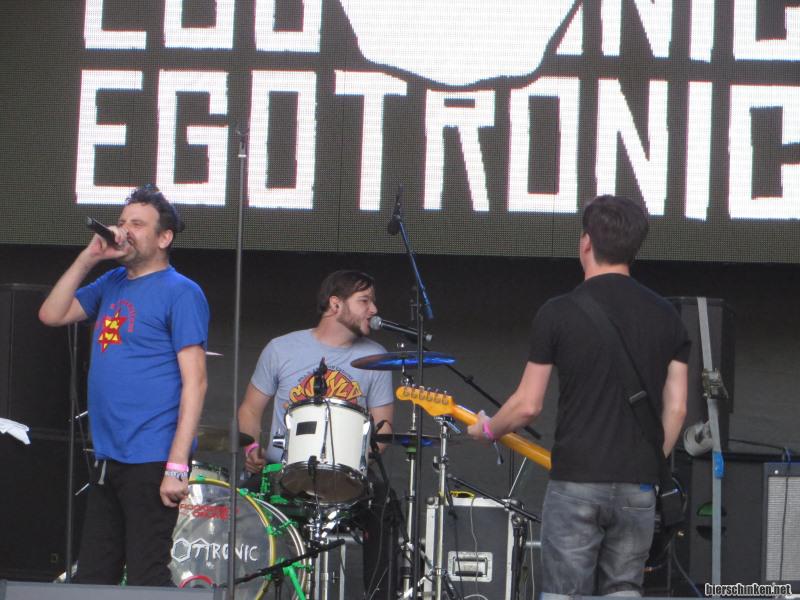 Ja, Tatsache, Egotronic machen den Opener (buh!) auf der Hauptbühne (buh!). Also, nicht dass ich ihnen das nicht gönnen wollte - Egotronic haben schließlich Aussage, und dafür kann keine Bühne zu groß sein - aber mein persönliches Konzertempfinden präferiert nunmal kleinere Bühnen. Naja, das Leben ist kein Wunschkonzert und kein Ponyhof, manchmal muss man sich mit ner Schale geschnitten Obst zufrieden geben. Gibt auch Seifenblasen dazu.