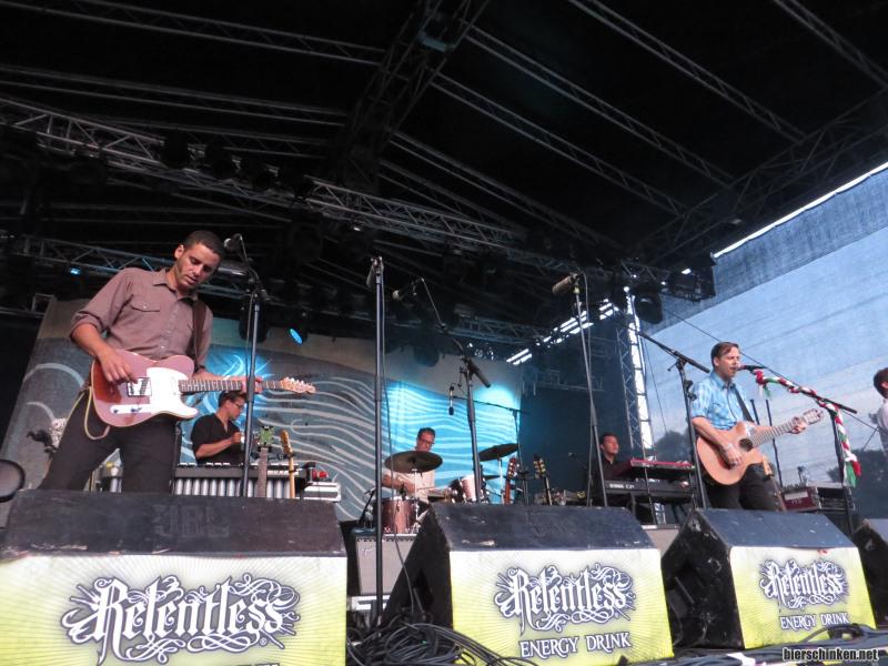 Puh, endlich. Genug Zeit rumgekriegt, um endlich CALEXICO sehen zu können! Wenn diese Band nicht spielen würde, hätte ich mich schon längst vom Acker gemacht und würde jetzt vernünftige Musik hören. Heute spielen ja zum Beispiel Tony Gorilla aufm Herr Walter oder Blatoidea im Rattenloch, aber nö, ich häng hier auf nem Elektro-Festival rum, um ne Folk-Band zu sehen.
