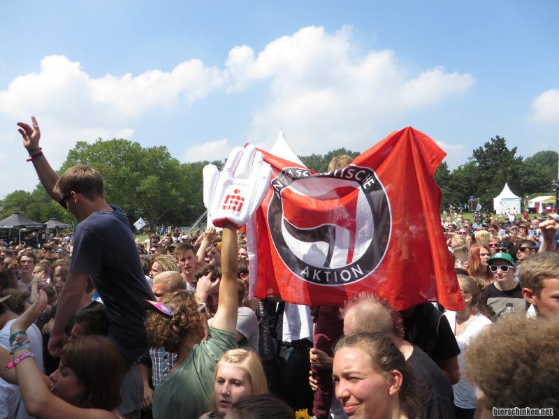 Die "Normalität" findet beispielsweise auch aufblasbare Handschuhe mit Sparkassen-Emblem total freaky. Gleichzeitig sieht man hier aber auch, dass vernünftige Leute ebenfalls den Weg vor die Bühne gefunden haben. Weitere Hits: "Rannte der Sonne hinterher", "Die Bismarck", "Glücksversprechen", "Pilze", sowas halt.