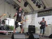 Nunja, wieder aufs Gelände. Mal gucken was einem sonst so geboten wird. Es gibt diverse Stände mit Textilien und Tonträgern aller Art, eine (sogenannte) Ausstellung mit Punkpostern aus Griechenland, und natürlich die obligatorischen Fressstände. Kleines Fazit dazu: Der Vöner für 5 Euro war etwas dürftig in Geschmack und Menge, die Curry-Kokos-Pfanne dafür echt lecker. den Burger habe ich nicht mehr testen können, den hatte ich mir für den dritten Festivaltag vorgenommen, und, äh, dazu später mehr.