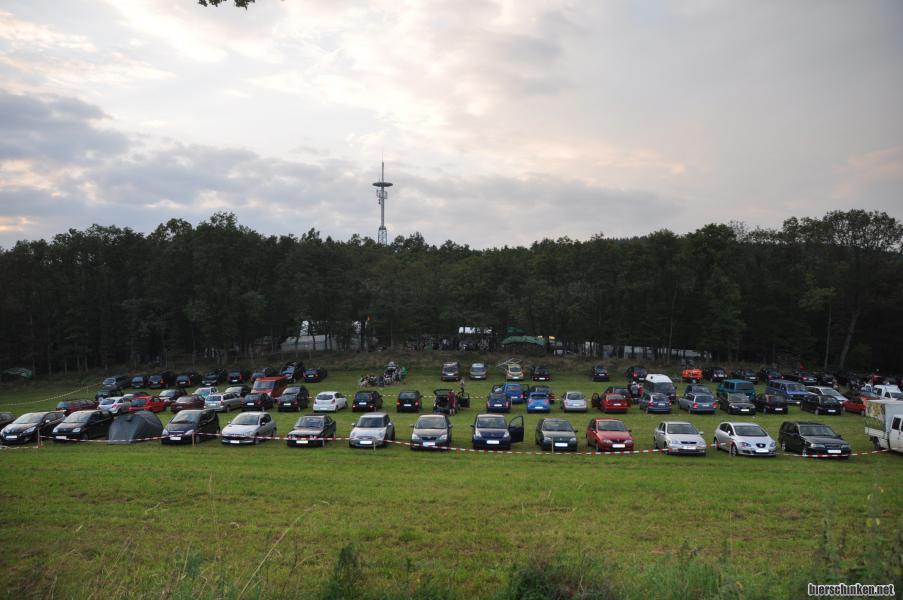 schlossi: Der Parkplatz. Sieht eher überschaubar aus, der größte Teil des Publikums bestand wahrscheinlich aus der Dorfjugend. Und die konnte zu Fuß nach Hause gehen, oder, falls das mit dem Gehen nicht mehr so funktioniert hat, einfach den Berg runterrollen.