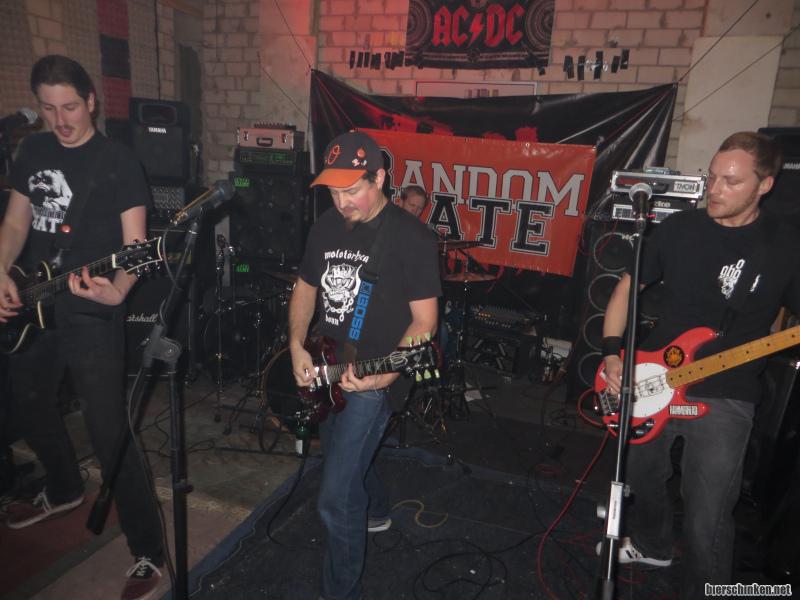 Wir betreten den Raum pünktlich zur ersten Band, deren Namen man hinten auf dem Banner lesen kann: Genau, AC/DC. Heute unter ihrer Geheimidentität als RANDOM HATE.