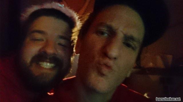 Wär's kein Foto, könnte man auch denken, dass hier von zwei Comicfiguren ein Selfie gemalt wurde. Der links hat angeblich noch mit Möbeln geworfen und der rechts seinen adrigen Pimmel gezeigt. Aber so genau weiß das auch einer mehr. Und die Palme hat ein Loch in die Wand gehauen. Dafür wurde die Palme danach auch kaputtgemacht. Scheißpalme!