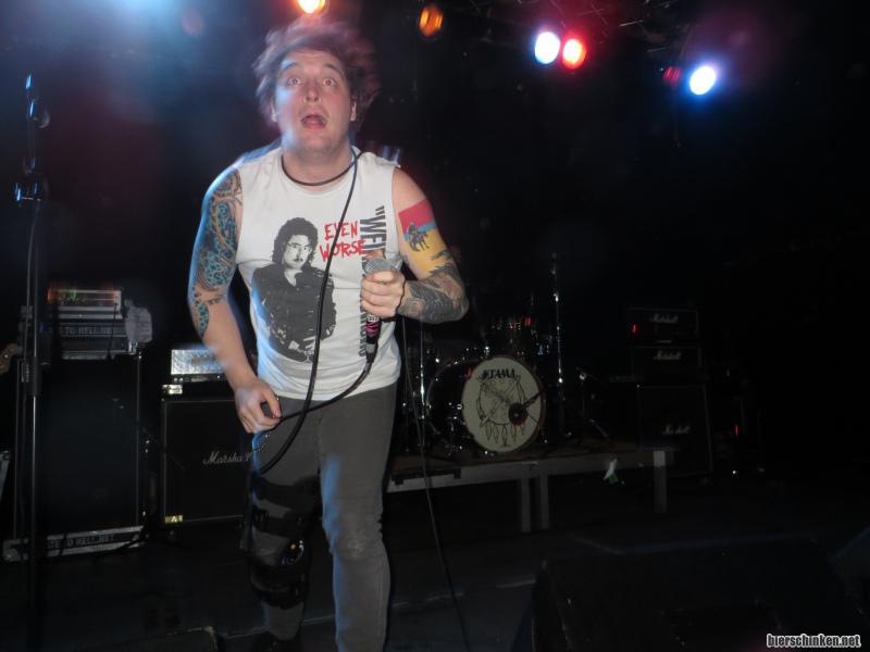 Fö: Der enthusiastische Sänger mit Beinschiene (oder wie heißt dieses Teil?) - was nicht heißt, dass er auch nur eine Sekunde still steht. Man bekommt so eine leichte Ahnung davon, wie er abgehen könnte, wenn er denn könnte.