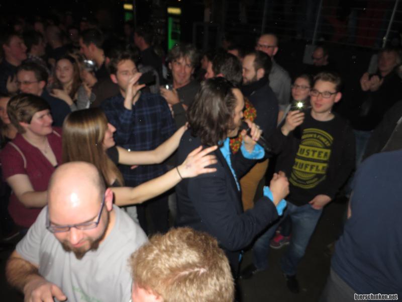 Juhu, Polonaise! Im ausverkauften FZW gar nicht mal so einfach, sich dort in eine vernünftige Schlange einzureihen. Aber die Polonaise ist ja auch bekannt als Gegenentwurf zur Chaostheorie.