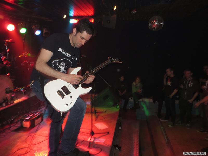 The Kollege: Ja also für Thomas´ Bass hat tatsächlich ein XLR-Kabel gefehlt. Kein Scheiß. Deswegen musste der über die DI-Box spielen. Für Fachunkundige: Der hört seinen Scheiß, den er spielt, also nur über die kleine Monitorbox am Boden. So. Wir fangen an, und Claus zum Mischer: "Der Bass ist zu laut hier auf der Monitorbox. Dreh den mal ab!" -- Tättää! Gag des Abends. Thomas hört also gar nix mehr von dem watt er da macht. Versuchts dann zwar noch tapfer ohne was zu hören, so mehr nach Gewohnheit und Gefühl - aber gibts dann einfach auf. Und zum ersten mal (in zwanzig Bühnenjahren!!) höre ich dass er meinen Standardsatz während dem Konzert zu mir sagt: "Warum mache ich diese Scheiße hier eigentlich noch!?" -- Riesen Lachflash!! Antwort: Genau dafür!