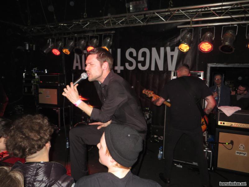 Geht nach einem großartigen Intro los mit "Jesus Christus", es folgt das komplette Album (nein, nicht in originaler Reihenfolge). Braucht bei mir ein wenig, um zu zünden - was aber anderen im Publikum ähnlich zu gehen scheint. Erstmal kritisch beäugen, das Ganze. Sind eingespielte Kirchenchöre Punk? Darf Felix die theatralische Jesus-am-Kreuz-Geste machen? Ist dieses ganze dunkle arroganter-Adam-Angst-Konzept geil oder scheiße?