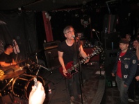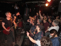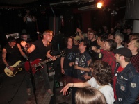 Es gibt so ne Säule mitten im Raum. Die finde ich am Anfang ganz angenehm, kann man sich gegenlehnen und lässig den Auftritt verfolgen. Aber irgendwann wird dann doch zu viel geschubst, da sieht das Lehnen nicht mehr lässig aus. Die Säule dient aber auch als Raumteiler - auf der einen Seite die besoffene Pogo-Meute, auf der anderen die Mitwipp-Mitgröl-Bande. Wann kommt es zum Clash?
