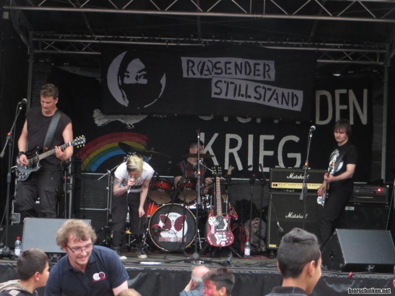 Nächste Band: RASENDER STILLSTAND KRIEG. Steht zumindest auf dem Banner, und Banner lügen nicht. Wie immer ein mitreißender Auftritt (ich hab mich ja mittlerweile dran gewöhnt, die jedes Mal besser zu finden, als ichs erwartet hätte). Zu Beginn noch etwas verkrampft aber mit gesunder Anti-Haltung - jemand hat sich wohl erdreistet, den Bandnamen als wenig sinnbehaftet zu bezeichnen. Aber die Band arbeitet halt mit so vielen Meta-Ebenen, da muss man sich erst mal rauswuseln. Vielleicht deswegen der neue Banner.