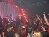 Der rote Salon der Werkstatt hat ne überschaubare Größe, für so ein Konzert eigentlich optimal. Trotzdem merkt man heute, dass die wenigsten Leute wegen dieser Band hier sind. Was dann zu diversen Lücken in den ersten Reihen führt, wo Leute ausharren, die auf die nächsten Bands warten. Und die wahnsinnige Angst vor Pogo haben. Angsterfüllt schauen sie jeden an, der sich ihnen auf weniger als nen Meter Entfernung nähert. Grazil werden einige tanzwillige Kleinkunstgruppenfans gar weggeschoben, nicht dass diese noch die Lücken in den Reihen ausfüllen. Pogo ist halt kein Zuckerschlecken. Die die dich kaputtmachen wollen sind in der Überzahl.