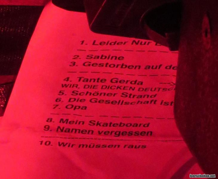 Fö: Hier eine Setliste der Kleinkunstgruppe. Jeder Song klingt, als ob er von irgendwo her geklaut wär - Na, wisst ihr woher? Ich sagte ja, nur Überhits. Ich schwelge in Erinnerung. Wie viele Sommerabende der Neunziger ich doch verbracht habe mit der Terrorgruppe. "Melodien für Milliarden" war übrigens mein erstes Punkalbum nach "Planet Punk" von den Ärzten. "Melodien für Milliarden" habe ich damals, gemeinsam mit Slimes erster, bekommen von einem ehemaligen Freund meines Bruders, weil der lieber Nazi werden wollte. Nazis sind schuld, dass ich so bin.