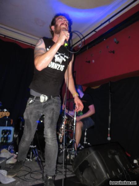 Kann aber irgendwann weiter gehen. Der Auftritt geht klar, kickt mich zwar nicht über Gebühr, reißt aber ganz gut mit. Ich nicke wohlwollend, auch ein wenig aus Angst, dass der Sänger mich sonst auffressen könnte. Er schaut immer so böse, während er seine infernale Stimme erschallen lässt! Wobei ich keine Ahnung habe, ob die Texte nicht eigentlich von Barbiepuppen und Gummibärchen handeln, so etwas wie Wörter kristallisieren sich da nämlich nicht heraus.
