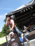 Und dann geht's schon weiter im Programm mit unseren Gastgebern CHRISTMAS. Wie schon mal erwähnt, bin ich eigentlich kein Freund von Turbonegro-like-Musik. Aber wenn eine Band eine solch famose Show hinlegt, muss man sie einfach gerne mögen. Max klettert erst mal die Bühnenbegrenzung hoch, sehr schön das. Ich bewundere ja Sport bei sengender Hitze, Hütchen ab!