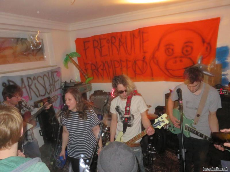 Wir haben nur keine Ahnung, wer das ist. Aus den Ansagen kann man nichts raushören, weil so viel Hall auf der Stimme liegt, dass einfach alles im Echo untergeht. Irgendwer will in Erfahrung gebracht haben, dass der Bandname mit T anfängt, ein anderer schlägt F vor. Dabei steht die Lösung doch hinten auf dem Backdrop: FREIRÄUME ERKÄMPFEN!