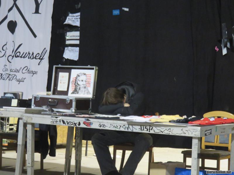 Fö: Was zunächst auffällt: Anders als andere Festivals, die man im AZ Mülheim so kennt, liegt noch nicht alles voller schlafender Suffpunks. Lediglich am Merchstand lässt man mal Fünfe gerade sein.