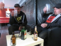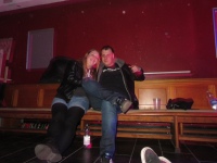 Das Schlimmste am Rockstar-Leben ist ja immer dieses Warten. Als waschechte Profis sind wir viel zu früh vor Ort und können die Zeit sinnvoll nutzen. Hier sieht man Ulf und unsere neue Schlagzeugerin Schlossi bei der Probe.