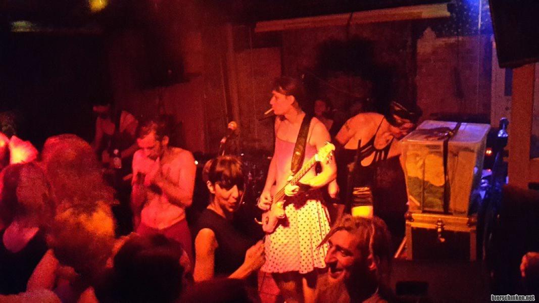 Die erste Band Girls, Girls, Girls haben wir verpasst. Schade. Dann The Feminists. Doch, hätte ich nicht gedacht: Die Band geschlossen im Turbonegro-mäßigem Verkleidungsmodus, so Frauen meets Gaybar irgendwie, und wirklich solider Rotzrock/Hardrock mit 70er Schlagseite.