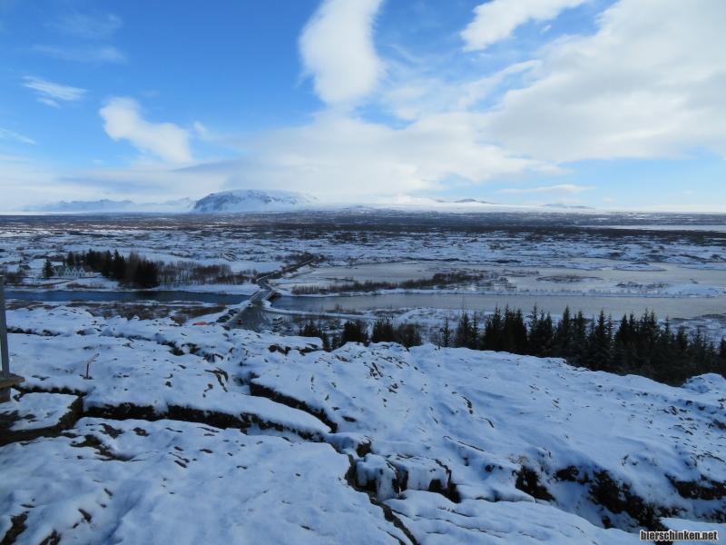 Los geht es mit dem kleinen, aber sehr schönen THINGVELLIR-Nationalpark. Hier kommt man zunächst auf eine Aussichtsplattform von welcher sich dieser tolle Blick auf den Park und auf einen Ausläufer des Thingvallavatn-Sees bietet.