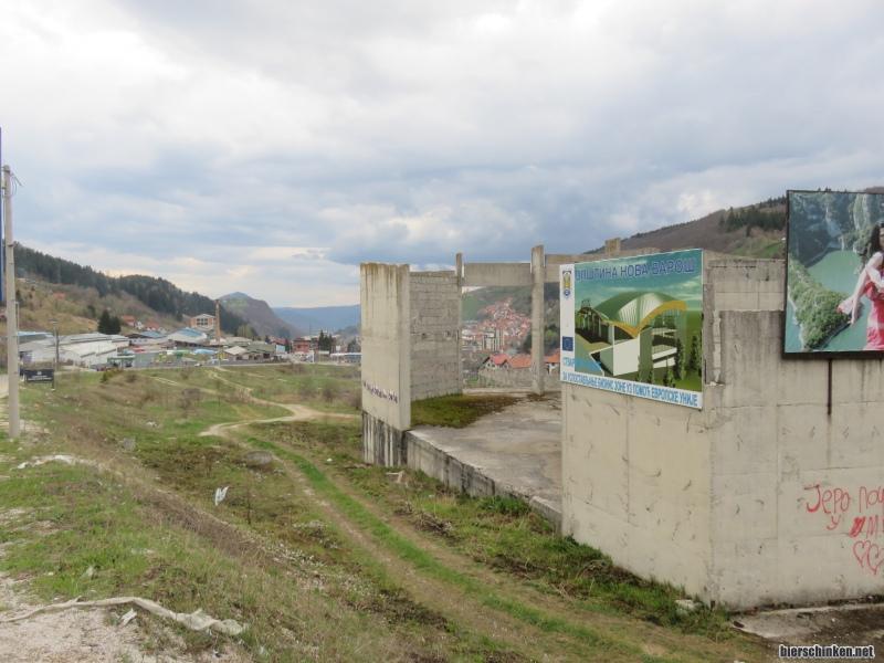 Fö: Nova Varoš selbst: Kein Kleinod an Bergörtchen, hier dominiert eher das schlichte Grau. Uns als Architekturbegeisterte interessiert vor allem dieses unvervollständigte Stück Betonklotz, das den Besucher bei Einfahrt in den Ort empfängt.