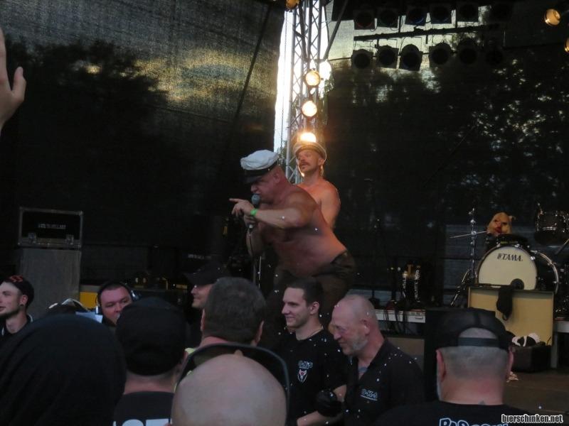 Fö: Schunkelpogo mit der Security. Ja, das wünscht man sich doch. Achja, ganz allgemein: Wieder mal ein Lob an die Bühnensecurity. Meistens freundlich, oft lächelnd, manchmal mitsingend, hier auch mal mitschunkelnd, öfters auch mal mitklatschend. Und gelegentlich wird auch mal Konfetti ins Publikum geworfen oder die Wasserpistole zur Abkühlung angeschmissen. Das tut dem Klima vor der Bühne echt gut (ja, auch dem sozialen Klima)
