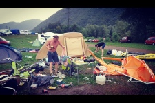Tja, wir mussten zu viert (!) unser Gemeinschaftsdach fest halten, während der Pavillon unserer Nachbarn zweimal auf uns drauf fällt. Im Hintergrund fliegen ganze Zelte vorbei. Meine Unterhose ist nass. Scheiß Berge! Nur Schrott-Wetter, entweder viel zu knalle heiß oder Sturm. Ich will zurück ans Meer!