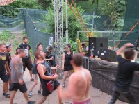 Ganz allgemein muss man sagen, dass sich der Merch-Bereich doch noch etwas ausbauen lässt. Die Locals, die am Anfang des Slovenian-Village Kinkerlitzchen und Firlefanz verkaufen, dürften glaub ich nicht so den Umsatz gemacht haben und wirkten etwas deplatziert mit ihren (AnarchieA) Kettchen, (AnarchieA) Kochlöffeln und (AnarchieA) Kaffeetassen. Auch gewundert hab ich mich über den Stand mit den elastischen Metall-Schnürsenkeln. Wer braucht denn sowas? Für meinen Geschmack hätten es ruhig noch ein paar mehr Platten und Shirt-Stände zum Stöbern sein dürfen. Ähnlich dem Groezrock-Festival.