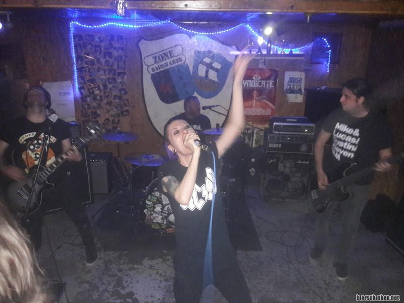 Nächste Band dann so gegen 21.15 Uhr: IN EVIL HOUR. Sie machen so Görrigkeits-Core, also druckvollen, schnellen Punkrock, der fast schon in die Hardcore-Ecke geht, mit Sängerin. Der Laden ist schon recht gut gefüllt, heißt, so 35 Leute sind drin und es ist tatsächlich recht eng. Bühne gibt es keine. IN EVIL HOUR erwecken erste Pogo-Tanzformationen. Außerdem wird geraucht, einerseits vom Publikum, andererseits von der Nebelmaschine.