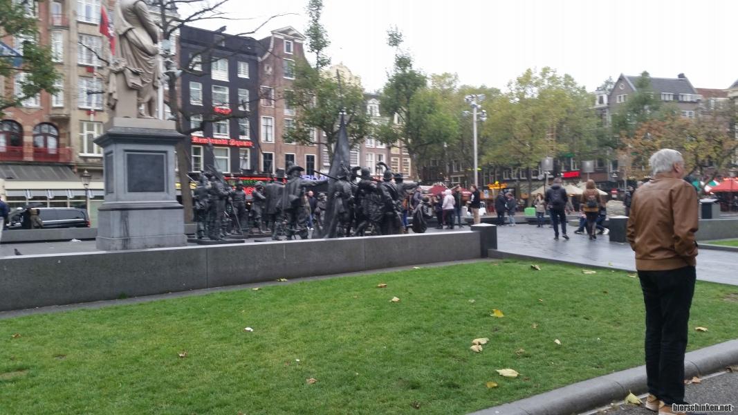 OleZeh: Gerne. Zu sehen ist das legendäre Ajax team von 1970, das unter Führung von Jean-Claude Fontaine (links auf dem Sockel) die Championsleague und(!) den Weltpokal gewann. Ganz vorne im Bild ist die Nachbildung des treuen Balljungen Pieter D. zu erkennen. welcher die Herzen der Welt gewann als er vor Erregung, ob des just gewonnen Weltpokals, hinter dem Tor ohnmächtig wurde und in Zungen sprach. Ihm und dem eigenwilligen Trikotdesign ist die Heiligsprechung des gesamten Teams durch ein Kirchenoberhaupt in diesem - dem Lutherjahr(!)- zu verdanken. Im Vordergrund: Ein Pilgerer.