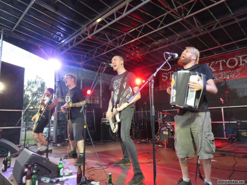 Zwen: Nun kann wieder gepogt werden! Die Folk-Punks von THE ROUGHNECK RIOT betreten nämlich die Freiluft-Bühne des Flugplatzes.