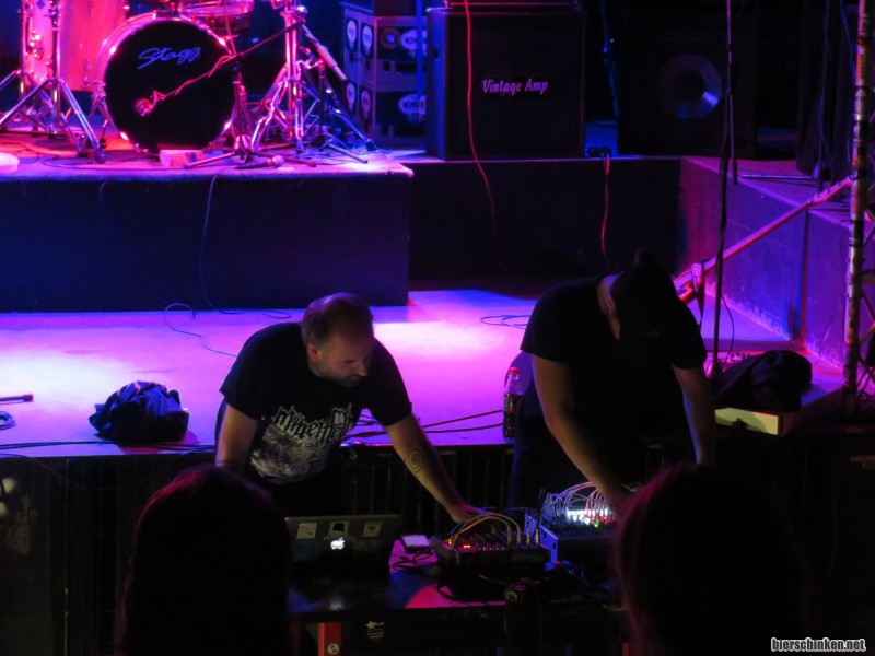 Erster Act heute Abend sind jedenfalls HAARP HYSTERIA. Die haben keine Instrumente, sondern stehen stattdessen vor technischem Gerät und erzeugen damit Sounds, die ich einfach mal irgendwo in die Industrial/Noise-Ecke schieben würde.