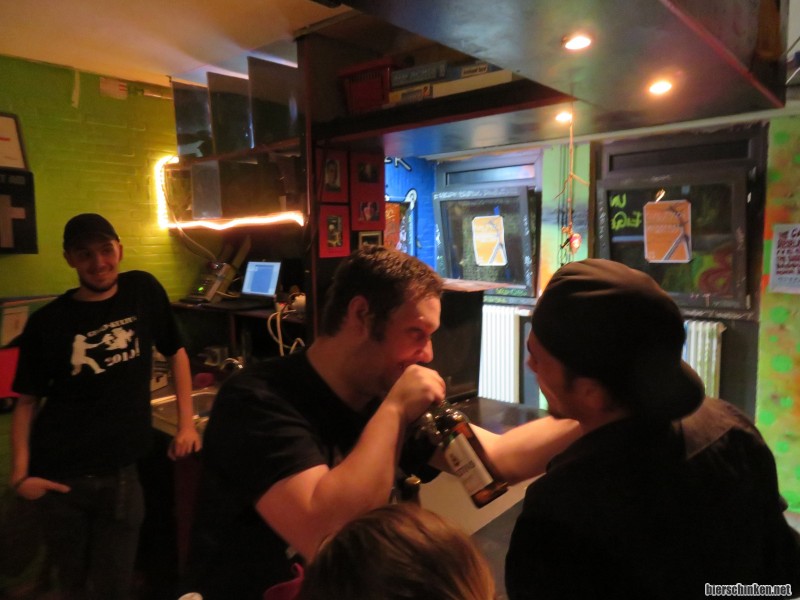 Ich gehe mal nach vorne zum Tresen und schaue mir das Kontrastprogramm an. Unter Aufsicht des Lawingats werden die größten Hits der letzten Jahrzehnte zum besten gegeben. Eigentlich deutlich witziger als das, was nebenan so passiert, trotzdem schaue ich mal wieder rüber.