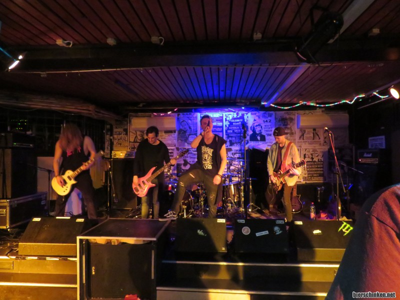 Ansonsten ist das Bühnenbild, das Left For Autopsy abgeben, eine wahre Augenweide. Ganz links der breitschultrige Tobi, dessen Bühnenperformance sich ganz um seine wunderschöne Matte dreht. Rechts daneben der Bassist, der sich eigentlich kaum bewegt, dafür aber einen dramatischen Ausdruck angenommen hat und damit jeden einzelnen Ton auch mit viel Gefühl (vor allem Hass) unterlegt. In der Mitte der Sänger Marke Rampensau, der immer einen Fuß auf der Box hat und dem man beim angestrengten Eierschaukeln zugucken kann. Ganz links dann der andere Gitarrist, der meist ein unschuldiges Schulbubengrinsen auf den Lippen hat und von seiner Physis wohl das genaue Gegenteil zu Tobi darstellt. Nicht zu vergessen der Drummer in Trainingsjacke. Hier sieht man definitiv, dass Schlagzeuger nicht mehr in die Muckibude müssen.