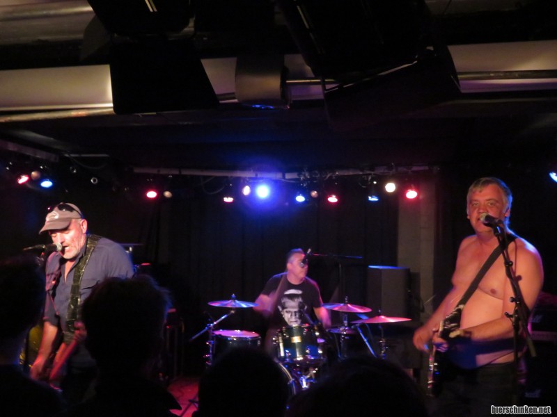 Beim Anblick der Band bin ich ja zunächst ein bisschen erschrocken. Vor allem Gitarrist John Onya sieht mit seinen zwei blauen Augen und der extrem verpeilten Art, wie er auf die Bühne torkelt, wirklich arg mitgenommen aus. Hat der sich geprügelt? Kann man sich in Münster überhaupt prügeln? Aber was solls? Da wird direkt erstmal das Shirt ausgezogen und rumgeblödelt. Im AZ würde das wohl nur so semi-gut ankommen.