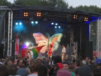 Auch ich bin absolut kein Fan von diesem 90er-Jahre-Eurodance-Abgefeiere. Aber egal. Natürlich schaut man trotzdem vorbei, wenn Blümchen spielt, und sei es nur aus Neugierde. Und ich muss sagen: Das war wirklich irre unterhaltsam! Trau ich mich gar nicht einzugestehen! Großartig, was die da an Bühnenshow auf die für so etwas viel zu klein dimensionierte Bühne schleppen. Einhörner, Herzen, Satelliten, Schmetterlinge, Tänzer, Fahrräder(!), ach, alles dabei.