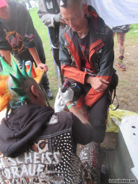 Kurz aber nochmal nen Abstecher zum improvisierten Tattoostand, wo ich hier nen guten Bekannten beim Kniescheibenkitzeln fotografieren durfte. Man konnte sich dort für einen freien Preis das Festivalmotiv stechen. Zitat: "Wenn du 20 Cent gibst ist auch okay."