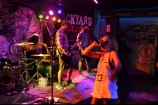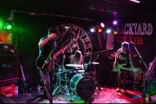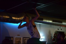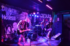 Uiuiui, DEATH BY HORSE! Wie schon gesagt hat das Album bei mir eingeschlagen wie eine Panzerhaubitze. Als wir reinkommen, springt uns dann auch direkt Sängerin Jahna entgegen, die eigentlich mehr vor als auf der Bühne rumtanzt. Zieht sie auch wie ein Flummi bis zum Ende durch und ist irgendwie immer überall. Also, ähnliche Bühnenpräsenz wie im Video zu "Dear Jim". So wird zwar der Respekt-Kreis vor der Bühne gut ausgefüllt, das Publikum geht da aber nicht so wirklich mit. Ich frage mich gerade ernsthaft, ob ich ein Sexist bin, da ich einem männlichen Sänger ein derartiges Animationsprogramm an einem Mittwoch-Abend (mit apathischem Publikum) sicherlich nicht mal so locker-flockig verziehen hätte und jetzt schon ziemlich angenervt wäre. Hmm...immerhin hatte ich noch ein T-Shirt an, also, alles gut.