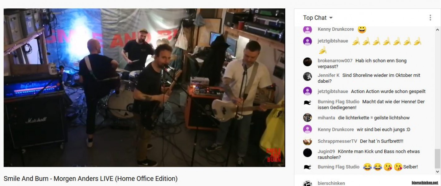Fö: Kommen wir zur ersten Band des Abends! SMILE AND BURN mussten ihr Weekender in Hamburg und Köln auf Ende Oktober verschieben, stattdessen kündigen sie einen Livestream aus dem Berliner Proberaum an. Stark! Das sind ja auch alles so Digital Natives, da kann man davon ausgehen dass es klappt. Oder? Man denke nur an dieses Videokleinod. Im Proberaum haben sie aber anscheinend ihre Techniker vergessen. "Die Amps gehen nur, wenn das Licht aus ist"
