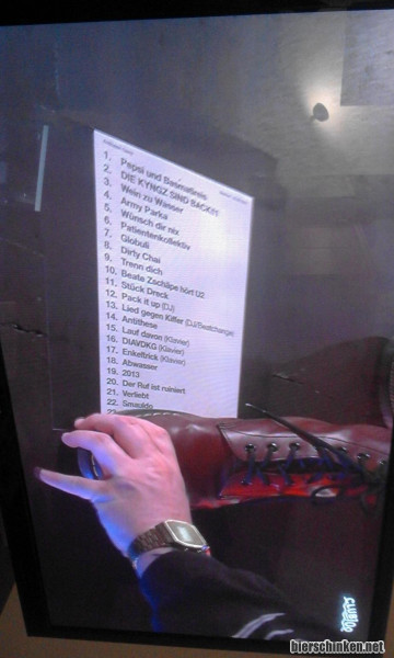 heinzzweidrei: Nachdem ich den ganzen Abend Stichpunkte festgehalten habe, wird zum Ende die Setlist eingeblendet- na toll! Aber wie mensch sieht: 23 Lieder wurden zum Besten gegeben. Der Fuß steht übrigens auf der Anti Alles Aktion- dieses Lied gab den Rausschmeißer!