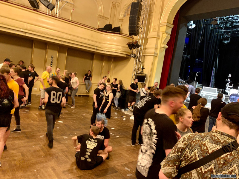 Um 21:35 wird nach zwei Zugabe-Blöcken der letzte Song gespielt. Postkonzertuales Rumlungern auf Parkett. Es gibt tatsächlich auch noch "echte" (gestellte) Iros im DÄ-Mainstream-Publikum. Wer hätte das gedacht.