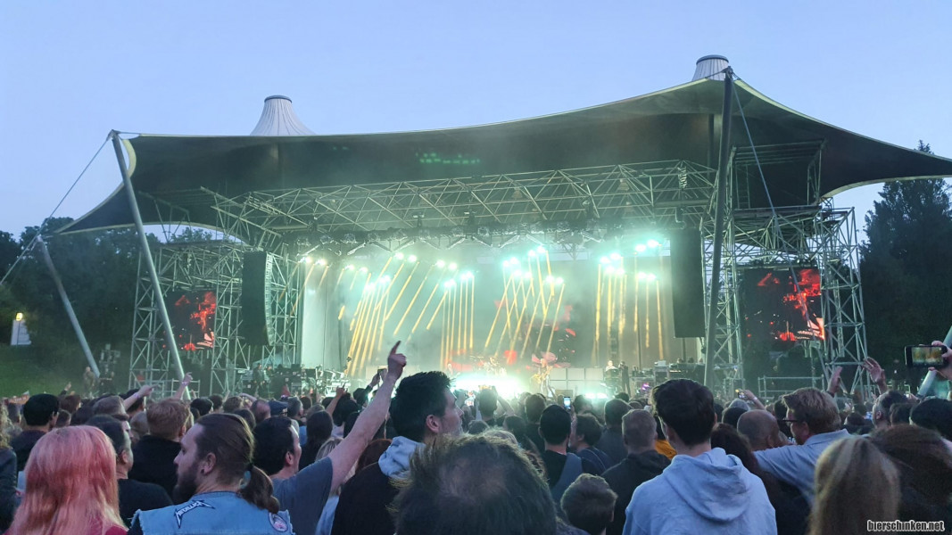So wird weiter in der Green Day Plattensammlung gewildert, aber Schwerpunkt liegt schon auf Songs aus "Dookie" und "American Idiot", die auch am meisten abgefeiert werden....mal ein Kiss-Cover zum auflockern und ein Typ mit Kiss-Maske, der diesen optisch unterstreicht.