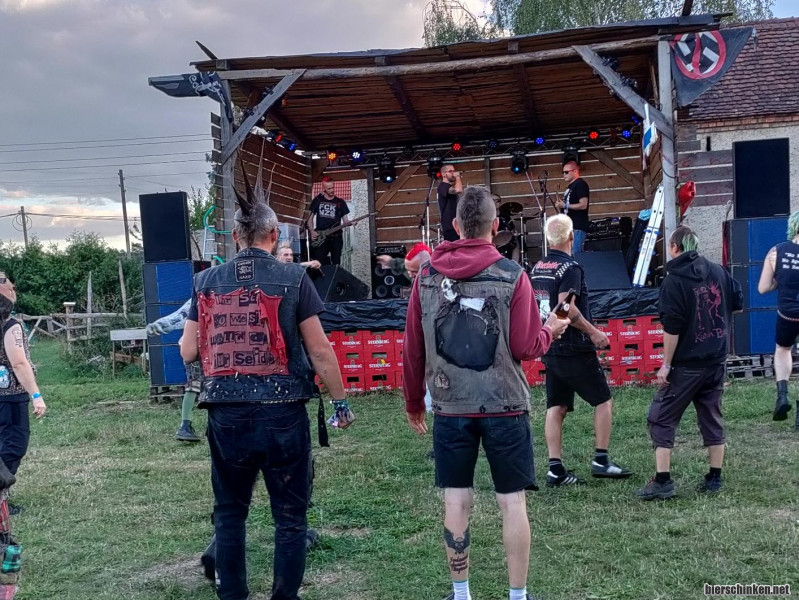 Die Inflation schlägt auch hier zu und der halbe Liter Uri schlägt mit 2€ zu buche. Absagen gibt´s derweil von Dummer Zufall, Tikes und Abbruch zu berichten. Erste Band PROBLEMKLIENTEL. Auf einmal kommt mir Gesehenes leicht bekannt vor. Die eröffneten schon letztes Jahr das Festival.