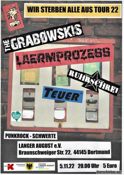 Heute die Schwerte Connection. THE GRABOWSKIS bringen ihre Kumpels von RUHRSCHREI mit, LÄRMPROZESS hab ich irgendwann schonmal gehört das Wort, TEUER noch nicht. Der Laden ist auch sonst voller Schwerter Leute, allzu viele Dortmunder aus der Gegend die man sonst auf Konzerten sieht finde ich hier nicht. Wirkt wie ein kleiner Schwerter Betriebsausflug.