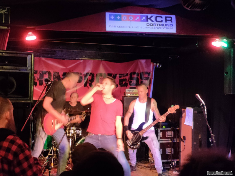 Zweite Band sind dann LÄRMPROZESS. Was soll man sagen, die Jungs sind richtig sauer, zumindest Sänger und Bassperson. Das hier ist wütender Punk mit ähnlichen Anti-System-Inhalten wie Teuer zuvor. Hier wird es aber deutlich punkiger und räudiger rübergebracht, sodass der Laden ein bisschen mehr brodelt. Macht gut Laune. Musikalisch sind die auch recht versiert, da sie wohl einfach schon länger spielen. Vermutlich der erste Gig nach einer längeren Zeit, aber sie scheinen geprobt zu haben.