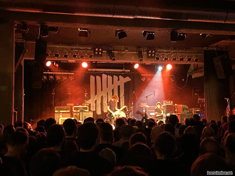 Es ist nicht ganz ausverkauft, aber richtig viel Platz ist auch nicht mehr. Am Merch ist schon einiges los und gerade für das Zeug von Mobina Galore gibt's ordentlich Nachfrage. Leider ist deren Stand noch unbemenscht, aber die Pascow-Mercher helfen aus. Kurz darauf geht's auch schon los.
