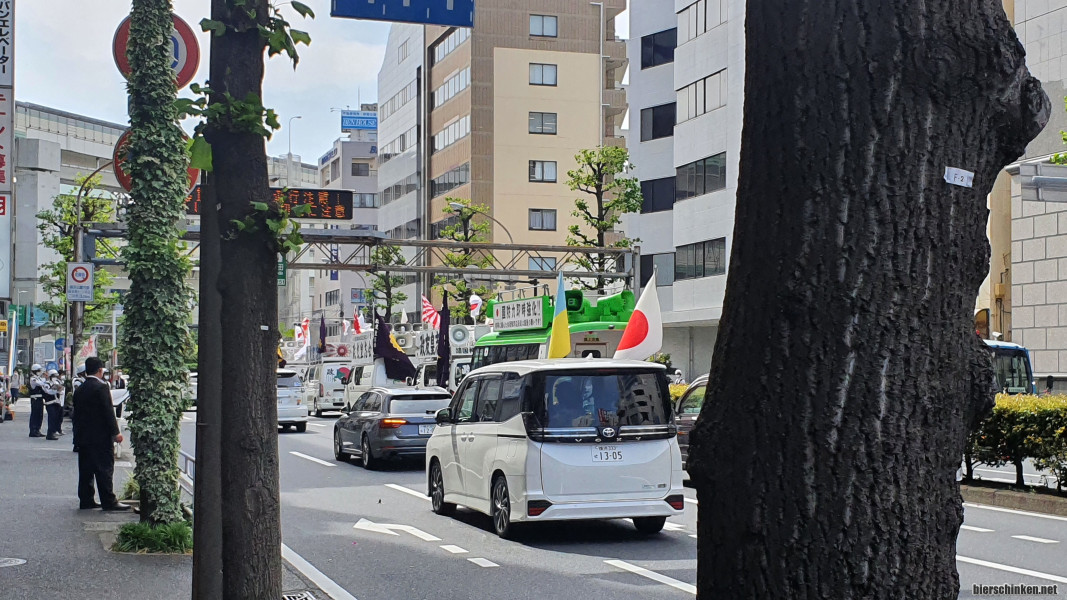 Als ich beim Luft schnappen vor der Tür von einer ohrenbetäubenden Stimme angeschrien werde, welche zwei Straßen weiter zu verorten ist, gucke ich mal was da so abgeht. Später stellt sich heraus, dass das hier wohl eine Demo des rechten Rands war. Da fährt man halt mit Autos durch die Gegend und schreit die Menschen in Düsenjet-Lautstärke über PA-System an, mit denen man in Deutschland Festivals beschallen würde