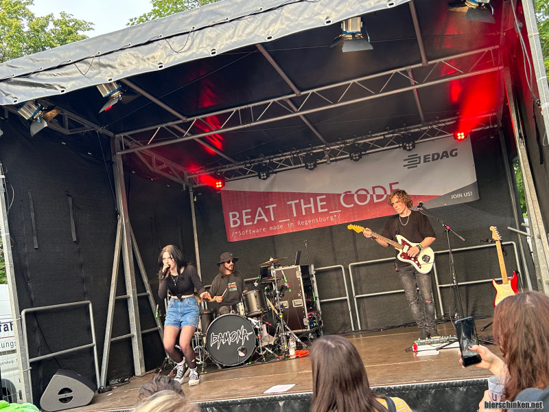 Nun DANONA, die sind leider für GET JEALOUS eingesprungen - meinem eigentlichen Megahighlight für heute. Get Jealous zu ersetzen ist ja ohnehin unmöglich, DAMONA aber kriegen das so gar nicht hin. Ist so Indiepoprock und wirkt fürchterlich gecastet, sodass wir schnell wieder von dannen ziehen & versuchen zu essen. Leider scheinen auf dem Campusfest einfach zu viele Leute zu sein. Die Schlangen sind überall unendlich lang (außer am Rotary-Club Weinstand) und so warten wir eben einfach auf den überfetten Headliner.