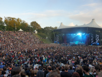 Bisher immer nur Positives über die Wuhlheide gehört, kann ich zumindest die Atmosphäre als sehr angenehm und entspannt verbuchen, was insbesondere an dem größtenteils sympathischen Filterblasenpublikum gelegen haben wird. Wir erwischen einen Platz auf den Rängen und in der omnipräsenten Sonne, die uns zum Glück nicht direkt ins Gesicht knallt. Die Bierpreise waren erwartungsgemäß schlimm hoch (6 Euro), so dass ich es tatsächlich geschafft habe, mich den ganzen Tag mit nur einem Bier zufrieden zu geben. Zugegebenermaßen wollte ich auch wegen unnötiger Toilettengänge nichts von der angekündigten 4-Stunden-Show verpassen. Weiterer Minuspunkt: Polizeipräsenz auf dem Gelände.