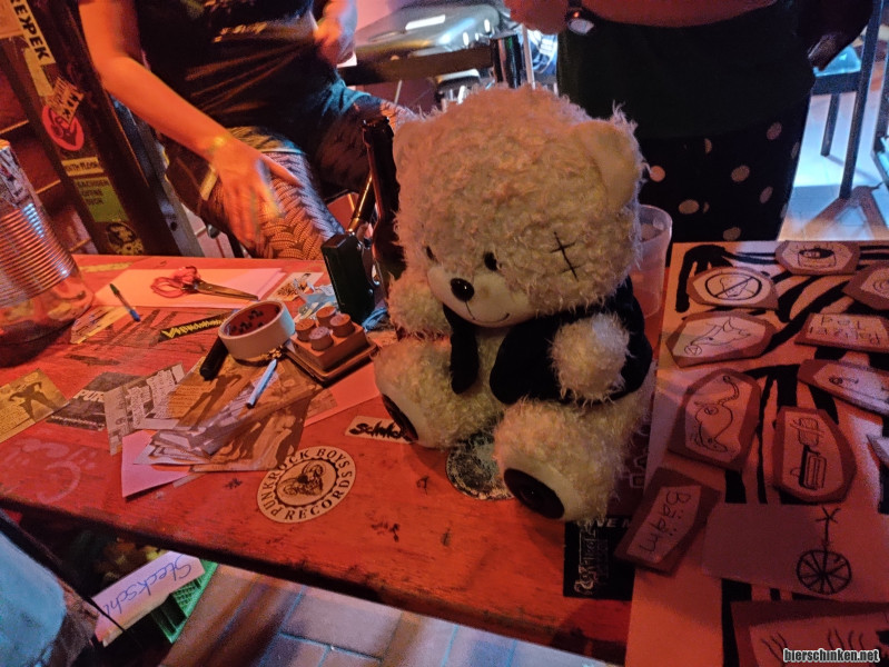 Das Picknick hat auch noch andere Attraktionen zu bieten. Es wurden Klamotten trocken geföhnt, wie erwähnt gab es Bingo, außerdem eine "Schminkpistole". Leider war es nur ähnlich eines Kinderschminkens; wir hatten uns was irres Mechanisches vorgestellt, wo auf jeden Fall etwas Luftlinie überbrückt wird. Und hier noch das Tattoo-Glücksrad. Rechts im Bild eine Auswahl an Motiven.