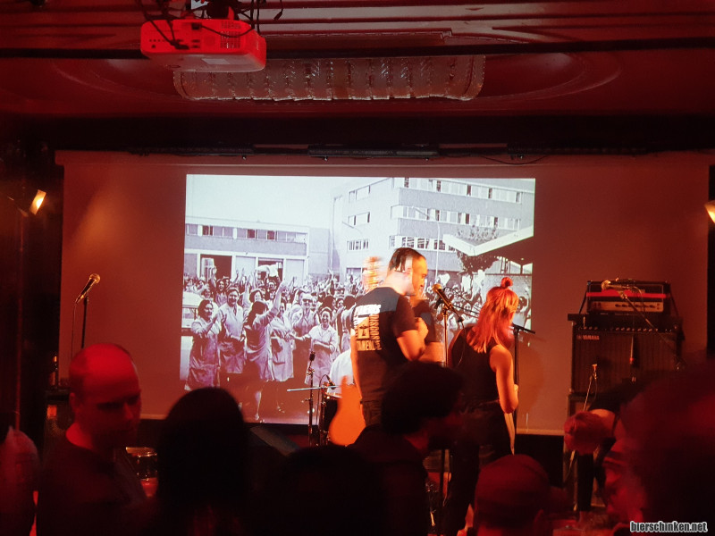 Vor und während der Konzerte lief eine Diashow von Fotos von den Arbeitskämpfer*innen damals in Neuss. Außerdem gab es einen Fernseher, der mit Kopfhörern versehen war und wohl anhand einer Dokus den Arbeitskampf audiovisualisierte. Und dann gab es noch an einer Wand - ich glaube - Poster zu sehen, die höchstwahrscheinlich weitere Infos zeigten. Also kein Vortrag oder ähnliches, was ich persönlich ein bisschen schade fand.